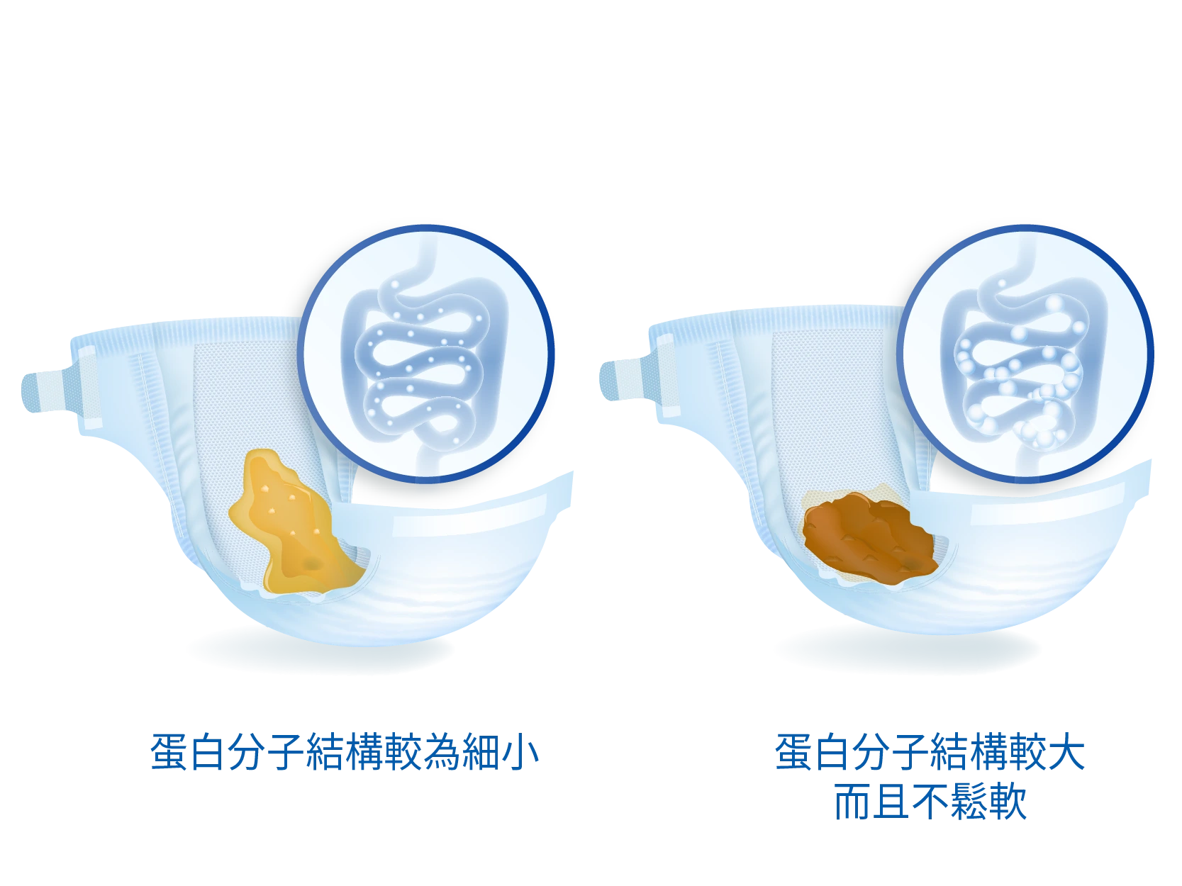 初生嬰兒的腸胃功能尚未成熟,胃酸及消化酵素較少,未能消化分子較大的食物,只可飲用母乳或配方奶吸收營養。然而,食材當中的營養素的各種特性影響消化程度,繼而反映於便便形態上。以蛋白質為例,一般而言,蛋白質的分子較為細小結構的話,較易被寶寶消化,便便形態自然相對稀。就如飲母乳的嬰兒,便便一般會較水狀;而一些配方奶含較大蛋白分子,結構又不鬆軟,嬰兒飲用完,便便自然就會近似泥狀。