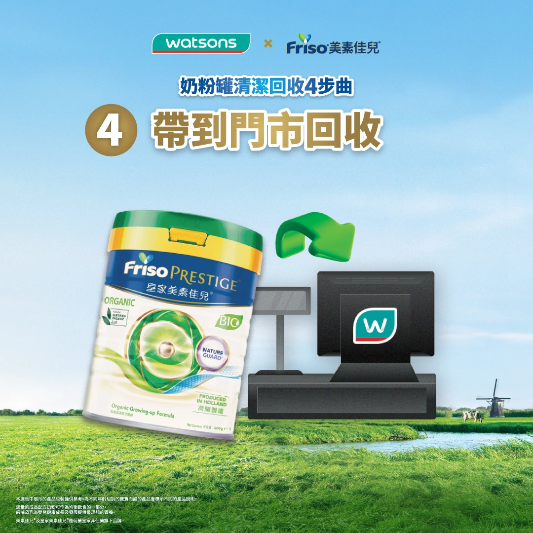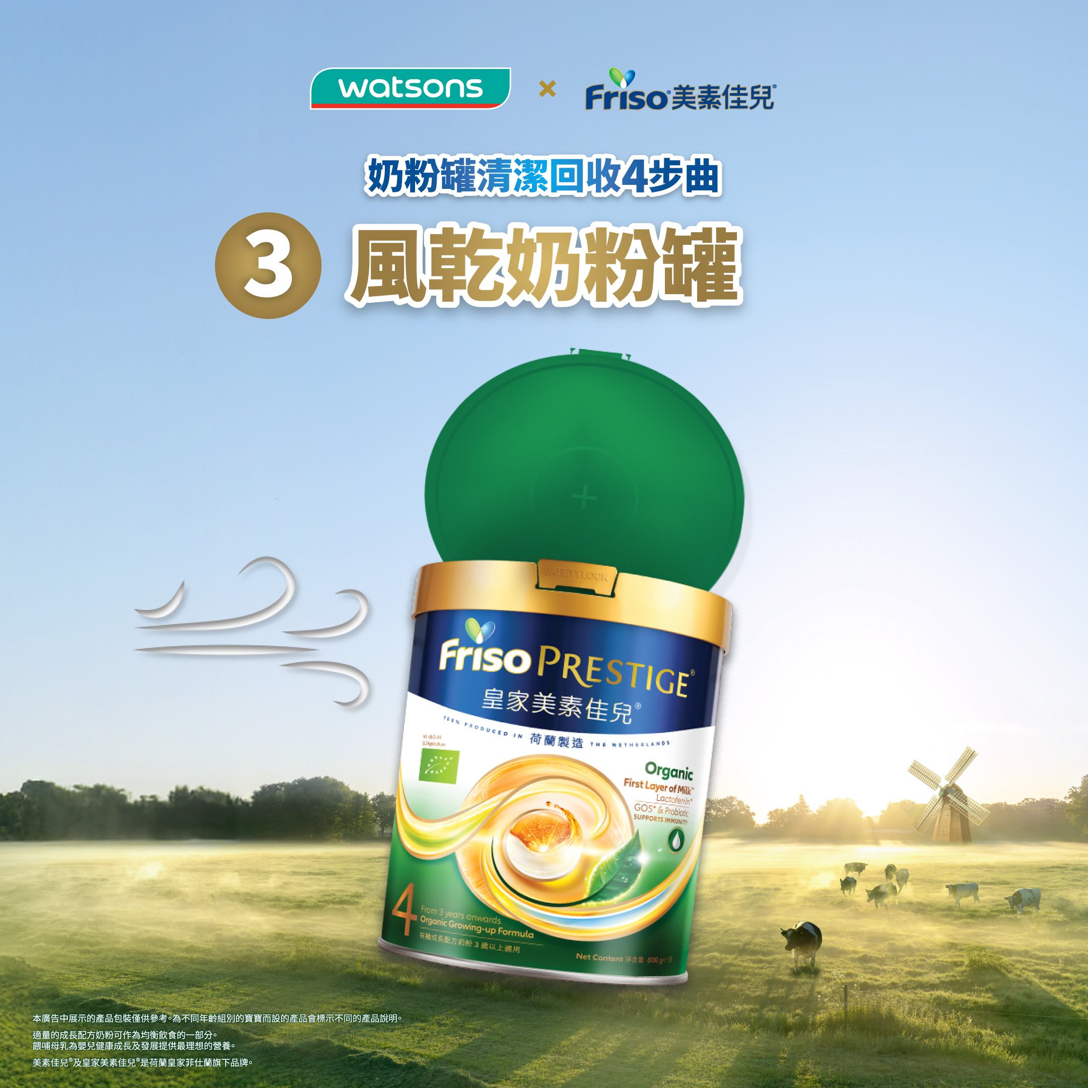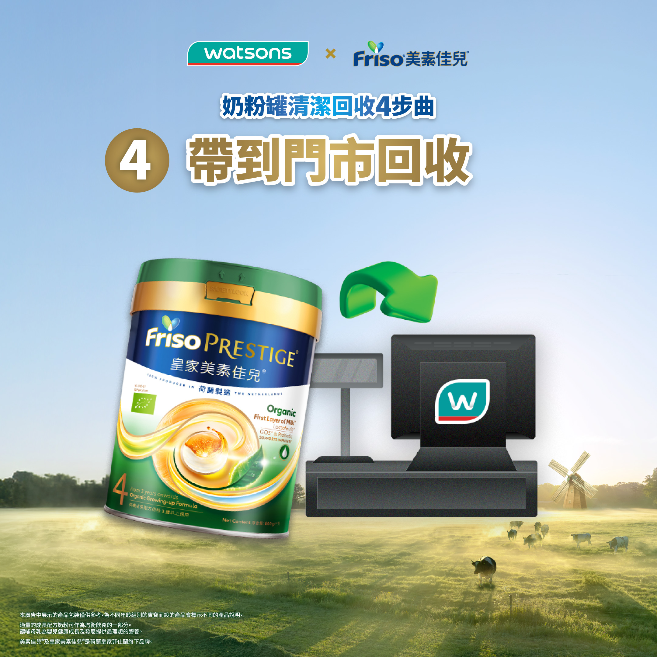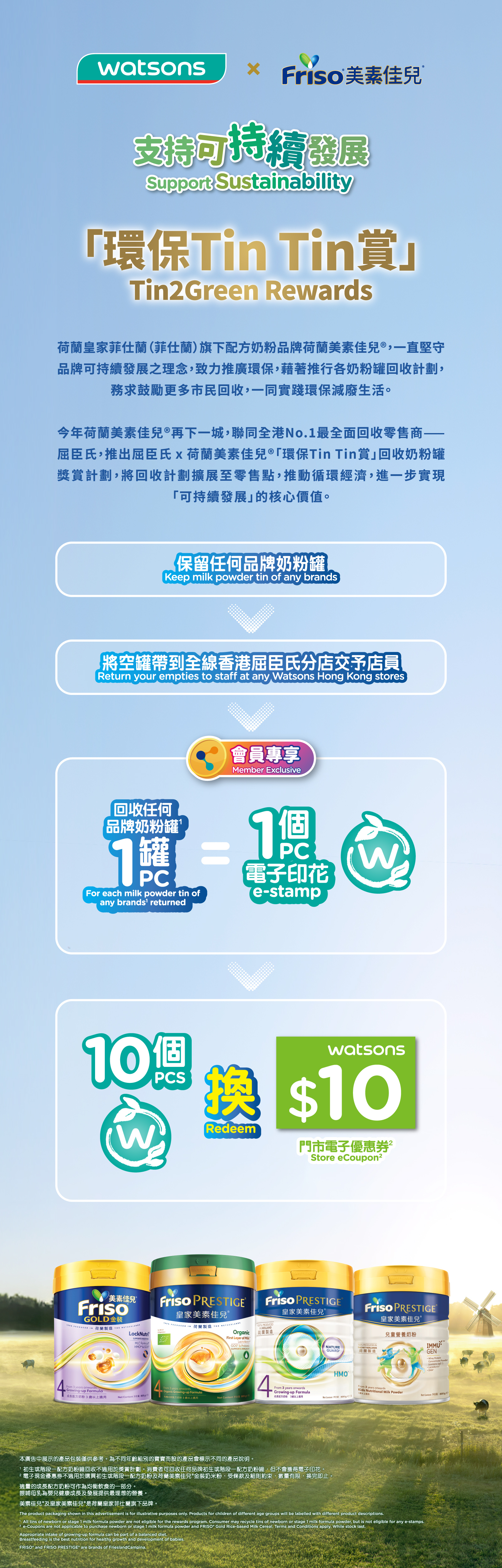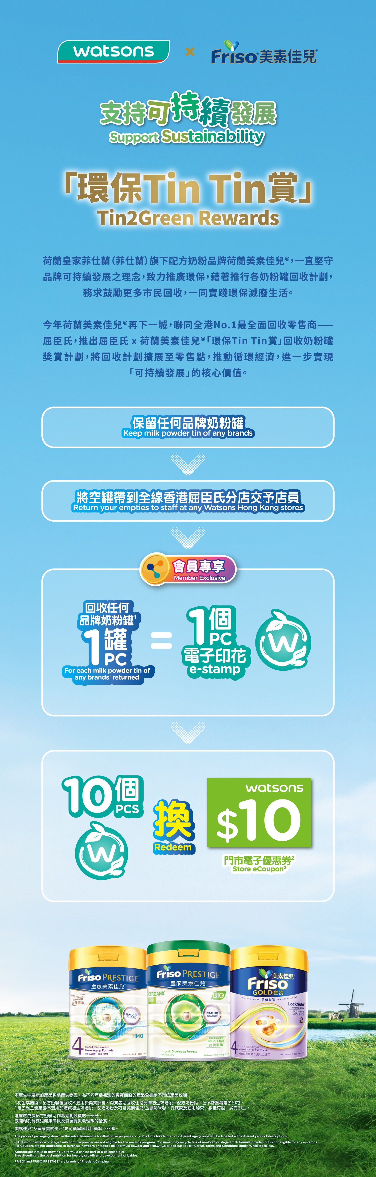 荷蘭皇家菲仕蘭(菲仕蘭)旗下配方奶粉品牌荷蘭美素佳兒®一直堅守品牌可持續發展之理念,致力推廣環保,藉著推行各奶粉罐回收計劃,務求鼓勵更多市民回收,一同實踐環保減廢生活。今年荷蘭美素佳兒®再下一城,聯同全港No.1最全面回收零售商——屈臣氏,推出屈臣氏 x 荷蘭美素佳兒®「環保Tin Tin 賞」 回收奶粉罐獎賞計劃,將回收計劃擴展至零售點,進一步實現「可持續發展」的核心價值。 由即日起至2025 年12月 31日期間,消費者只需攜同已用完並清洗乾淨的任何品牌奶粉罐至全線香港屈臣氏門店,並出示易賞錢會員二維碼,每回收奶粉罐1個1,即可獲「環保Tin Tin 賞獎賞計劃電子印花」(電子印花)1個。易賞錢會員憑10個電子印花,可免費換領屈臣氏 $10門市電子現金優惠券乙張2。 其中6間屈臣氏門店更增設奶粉罐回收箱!消費者領取電子印花後,可以讓小朋友親手把奶粉罐投入回收箱,教育他們培養愛惜地球的好習慣。 回收奶粉罐獎賞計劃地點: 全線香港屈臣氏門市 奶粉罐回收箱地點: 新界上水石湖墟龍琛路39號上水廣場4樓401-402號舖 新界屯門屯盛街1號屯門市廣場1期2樓2100B-C & 2115-2122號舖 新界沙田新城市廣場 1 期 4 樓 451-453 號舖 九龍旺角彌敦道655號胡社生行地下C1及C2號舖 九龍旺角太子道西193號新世紀廣場1樓153號舖 香港銅鑼灣恩平道44-48號恩平中心地舖1樓及2樓 奶粉罐清潔回收四步曲: